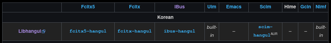 sudo pacman -S ibus ibus-hangul혹시나 사용중인 배포판에 IME 중 하나가 설치되어 있다면 한국어 패키지만 추가로 설치해주면 된다.