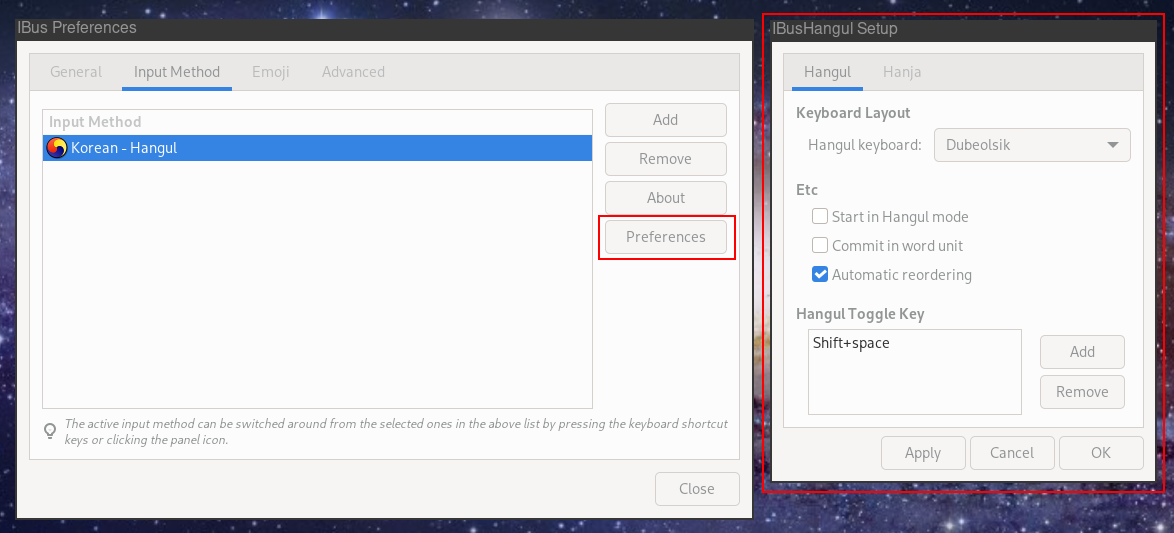 ibus-daemon -rxRdIME의 설정에서 한글 키보드 등록 및 한영전환 방식 설정하기