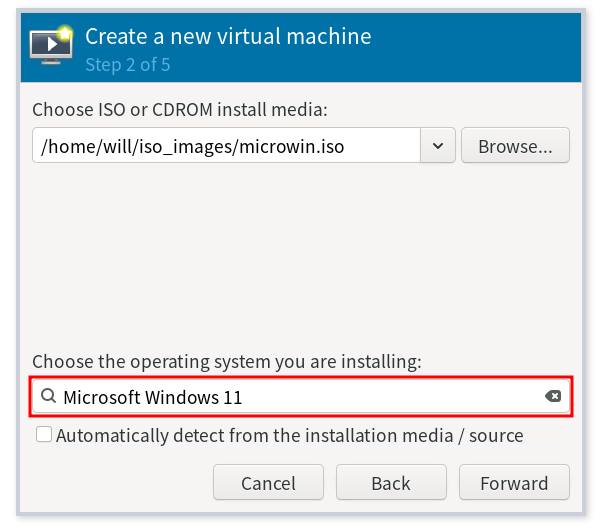 virtual machine 생성창에서 local install media(ISO image...)을 선택하고 forward해준다.