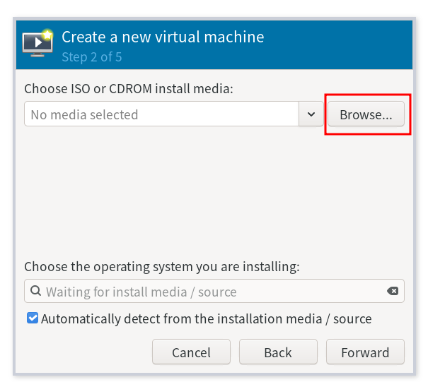 다음 화면에서는 설치할 os의 iso 파일을 선택해줘야 한다. browse를 눌러주자.