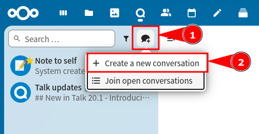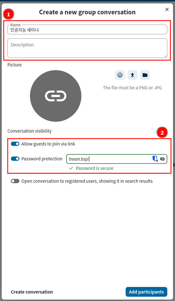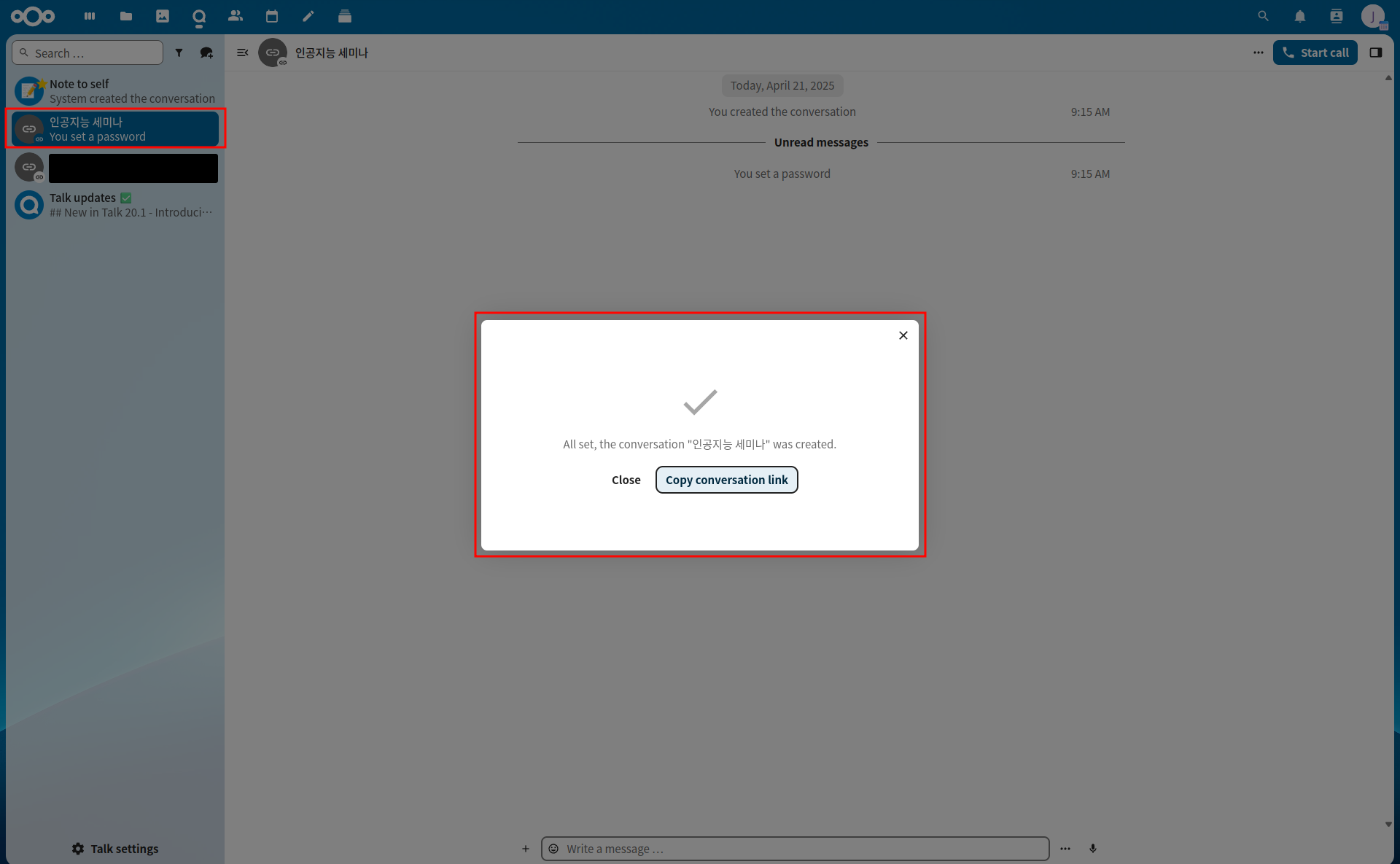 Nextcloud Talk 앱에서 새로운 대화방을 개설을 한다. 이미지에 표시된 순서를 차근차근 따라가면 된다.
