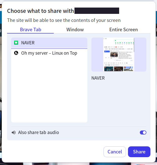 그러면 다음과 같이 공유할 화면을 선택하는 창이 뜨는데, 여기서 원하는 창을 선택해주면 된다.