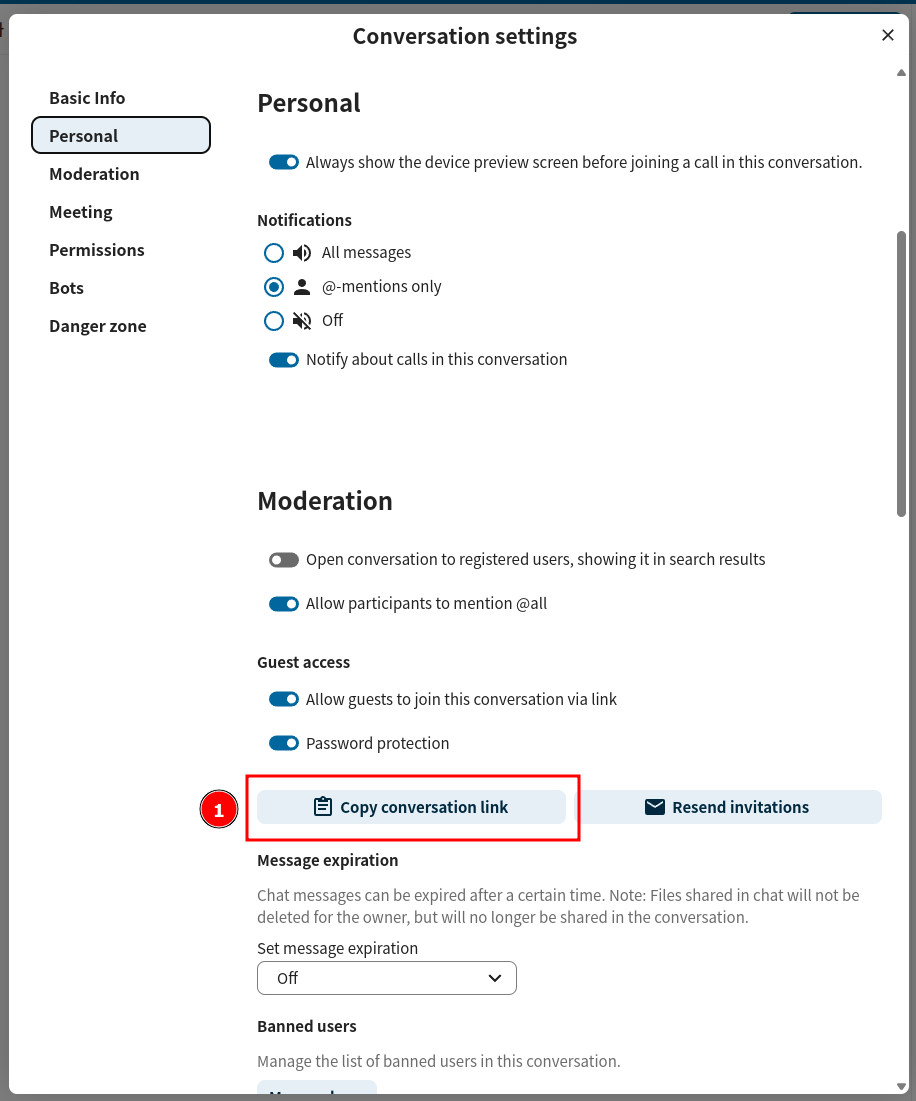 그리고 Personal 탭에 들어가서 다시한번 Guest access 설정을 확인한 뒤 Copy conversation link를 눌러 링크를 복사한다.