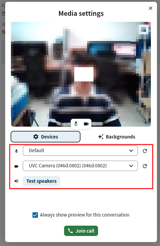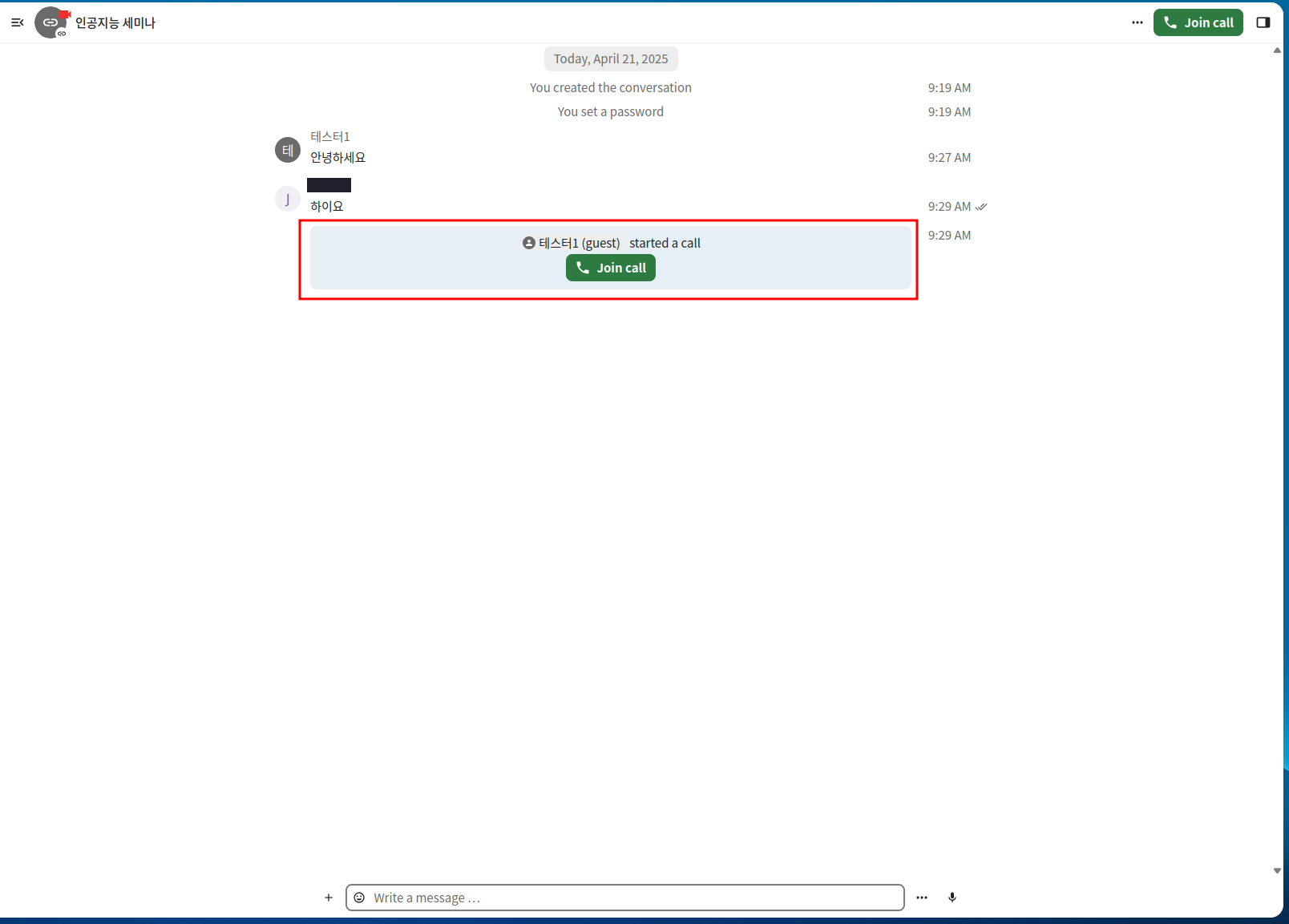 회의방의 누군가가 대화를 시작하면, 채팅방에 Join Call 버튼이 뜬다.